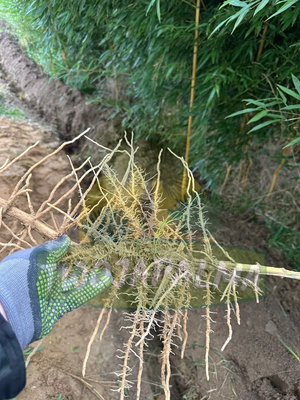 Bambusy drzewiaste (Phyllostachys) mają kłącza typu leptomorficznego, czyli takie, które rozrastają się na boki. To podziemne „pędy”, które rosną poziomo i z czasem wypuszczają nowe tyczki w kolejnych miejscach ogrodu. Takie kłącza potrafią przemieścić się nawet o kilka metrów, dlatego przy bambusach drzewiastych warto od razu zastosować barierę korzeniową — dzięki temu roślina zostaje dokładnie tam, gdzie ją posadzimy.Kłącza mogą wędrować nawet do ok. 3 metrów bambus może pojawić się daleko od miejsca sadzenia dlatego wymaga bariery korzeniowej.